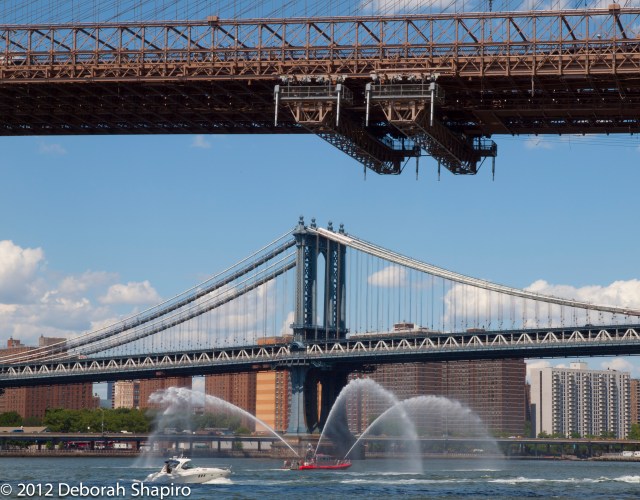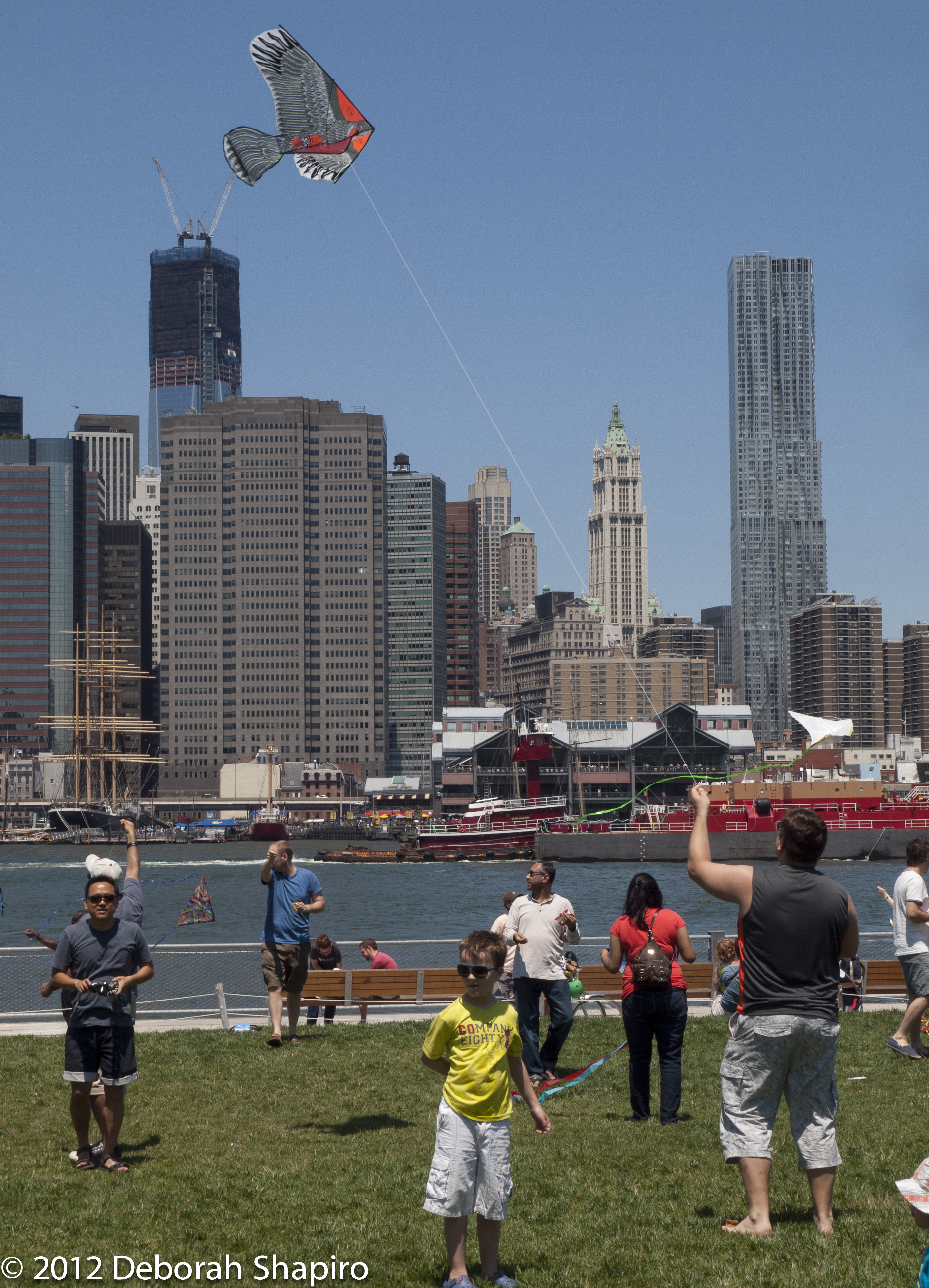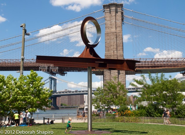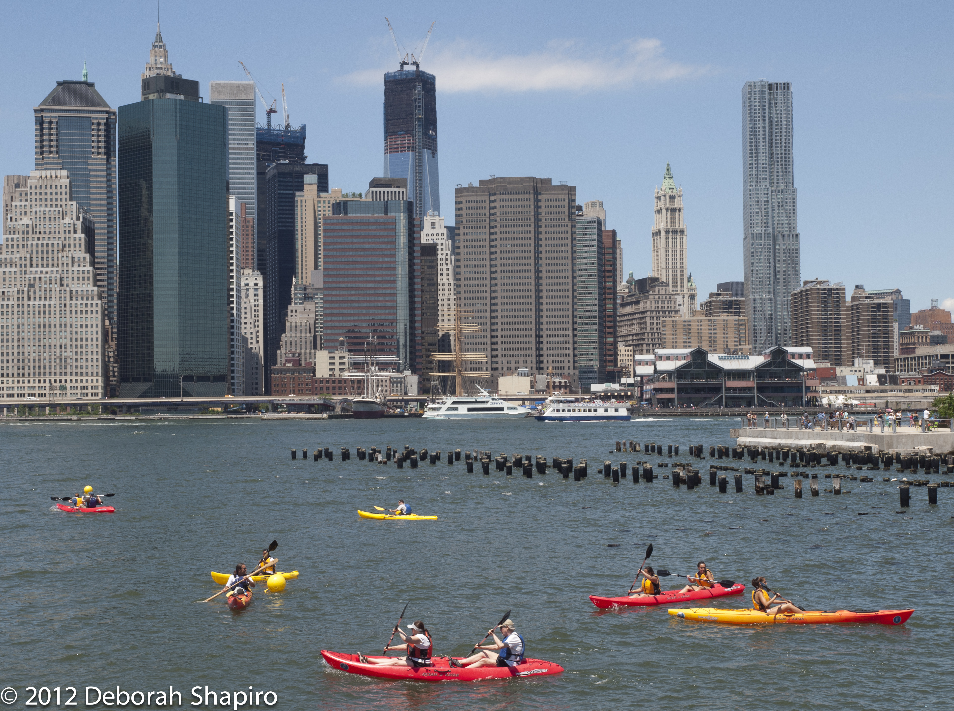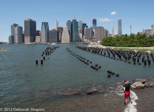 The Brooklyn Bridge Park, like the High Line, is another successful reclamation of post-industrial wasteland for recreational use. The section of the park that I visited today between the Fulton Ferry Landing and Atlantic Avenue consisted of derelict piers just a few years ago; now people are happily flying kites, kayaking, and riding bicycles with panoramic views of the lower Manhattan skyline and the Brooklyn Bridge. I was actually on my way to the second annual Photoville exhibit on Pier 3, where contemporary photography is shown in shipping containers. But before I could get to the exhibit, I was completely distracted by the park on a glorious summer day. One ominous sign: a turnaround area for tour buses. But there were only a few buses and their passengers were lined up in front of Grimaldi’s Pizza, leaving the park for Brooklynites to enjoy.