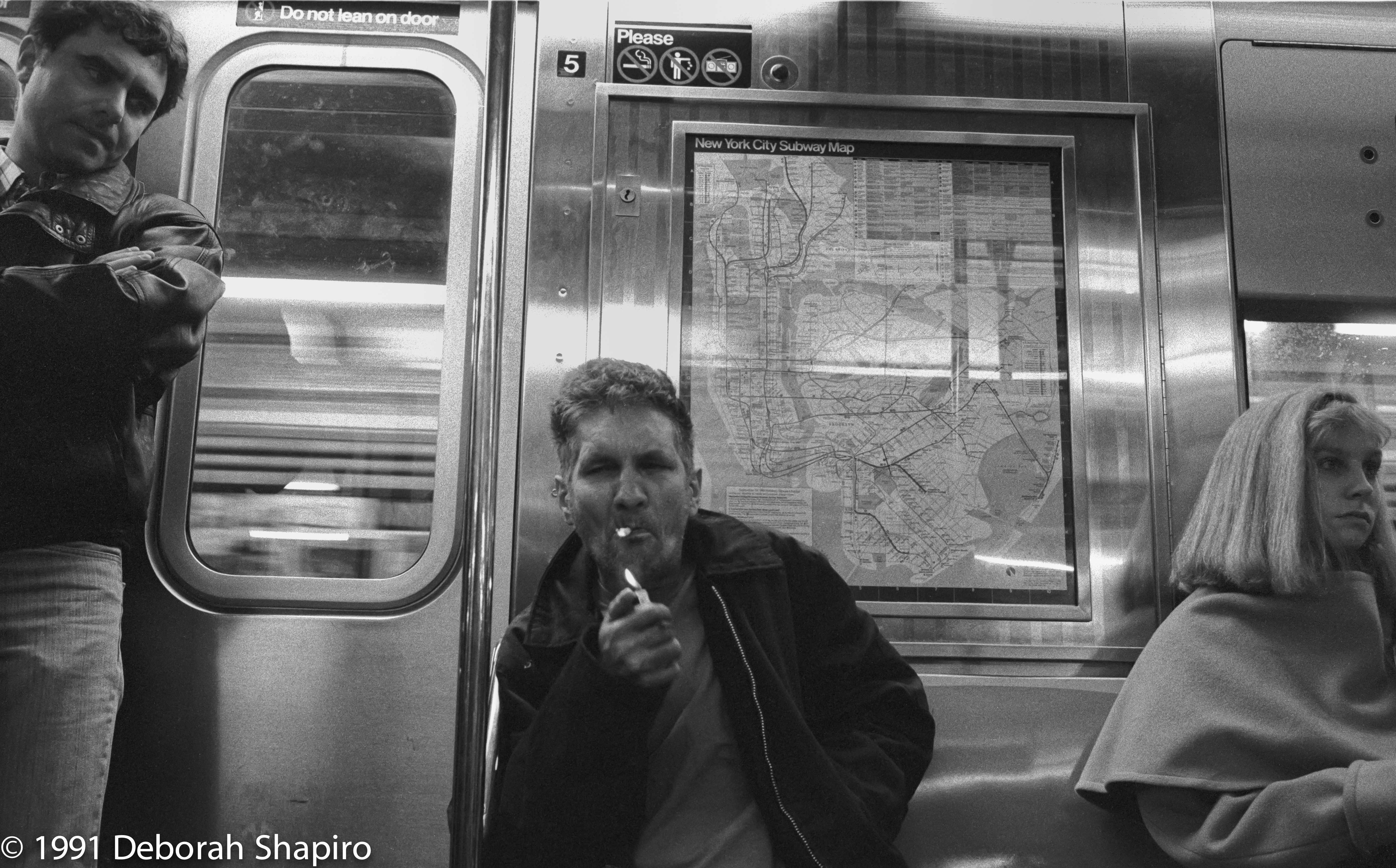 Antisocial. What makes the photograph is not the alcoholic guy lighting up on the train (that was just as illegal in 1991 as it is now), but the reactions of the other passengers.
