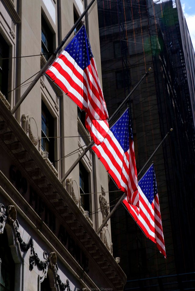 In the absence of a public memorial for the 18, 611 New Yorkers* who have died of Covid-19, these flags fly at half staff on Fifth Avenue. Photo taken on Independence Day, July 4, 2020.